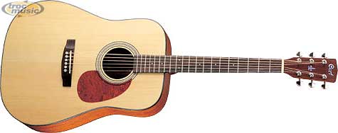Guitare forme dreadnought. Table épicéa massif, fond, éclisses et manche acajou, touche palissandre. Finitions: naturelle brillant (E100NA) ou satinée (E100TF).