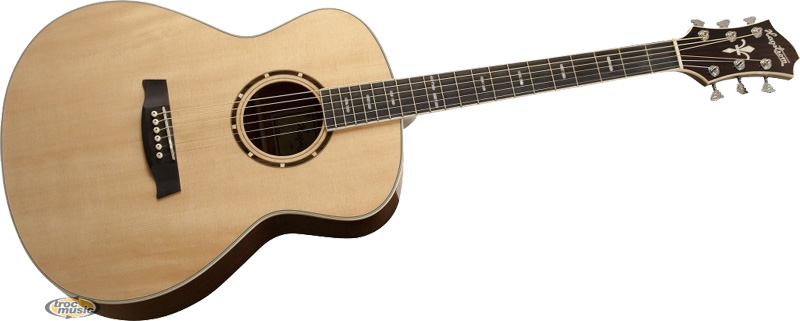 Manche : Collé en acajou. Touche : Bois composite avec filets ivoires, repères pearl & abalone Hagstrom. Tige de réglage : H-Expander. Mécaniques : Hagstrom chromées à bain d'huile. Table : Epicéa de Sitka massif avec filets ivoires. Rosace : Hagstrom. Dos & éclisses : Acajou. Chevalet : Bois composite. Finition : Brillante.