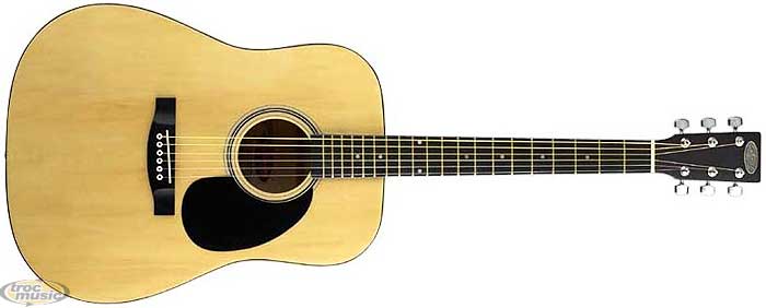 Guitare dreadnought naturelle, table/dos et éclisses tilleul, manche nato, touche/chevalet érable.