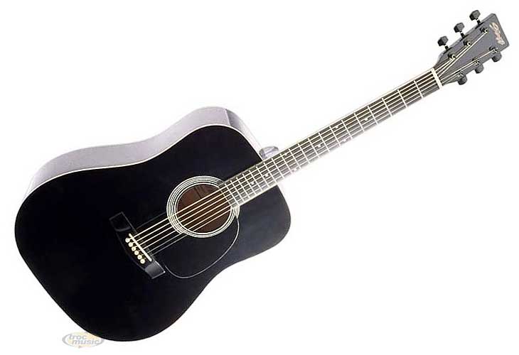 Guitare acoustique dreadnought noire. Dos et éclisses tilleul, manche nato, touche et chevalet érable teinté noir.