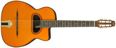 Guitare jazz manouche électro-acoustique grande bouche. Table épicéa massif. Dos, éclisses et touche palissandre. Manche 14 cases acajou. Grande rosace en ''D''. Micro piezzo. Finition satinée.