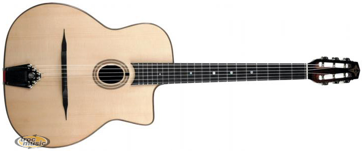 | Guitare jazz manouche model petite bouche. Manche acajou. Touche palissandre, 21 frettes. Repères de touche Pearl, façon 'Dots'. Tête ajourée, plaquée palissandre. Mécaniques chromes à bain d'huile, boutons pearl. Table massive en épicéa avec filet palissandre. Dos & éclisses palissandre, contre-filets érable. Rosace: Petite bouche ovale, marquetterie érable. Chevalet ébène. Cordier métal et palissandre. |