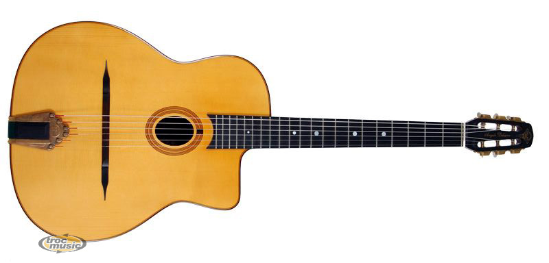 | Guitare manouche S.Gallato naturelle, livrée en étui. Table massive en Epicéa. Manche en Noyer - largeur au sillet : 43mm. Touche en ébène. Fond, chevalet, plaque de tête et éclisses en Palissandre. Filet 3 couleurs : acajou, érable et palissandre. Repères en nacre à la Française. Système de Truss-rod. Cordier Gallato. Mécaniques Gallato Type Maccaferri. Montée avec cordes argentines. |