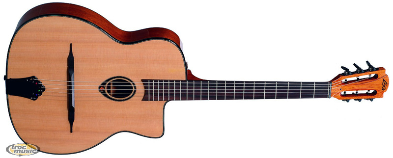 Guitare Manouche Petite Bouche - Naturel Brillant. Quoi de plus normal qu'une marque française nous propose (même si la production est finalisée en Asie) une reproduction des mythiques guitares Selmer-Maccaferri et Favino qui ont immortalisé le Jazz hexagonal entre les mains du non moins célèbre Django Reinhardt. Instrument d'initiation entrée de gamme au Gypsy Jazz ou à la Valse Swing, ici en version pré-amplifiée grâce au système DirectLag.