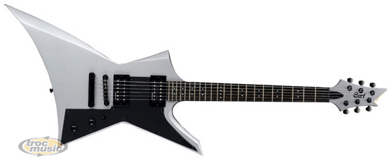 Guitare électrique forme en X. Corps agathis. Manche en 5 pièces, profil en ''C''. Touche palissandre. 22 frettes jumbo. 2 micros doubles EMG-HZ. Chevalet Tune O Matic. 1 volume, 1 tonalité. Selecteur 3 positions. Finition : Silver Metallic, White Pearl et Black. Livré en housse.