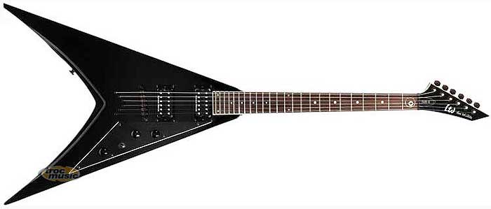 Guitares de forme Flying V. Corps acajou, manche 24 cases acajou, touche palissandre, frettes Jumbo, 2 micros double Seymour Duncan.