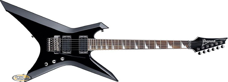 Guitare électrique - noire - forme Xiphos - avec étui. Humbucker Dimarzio D-activator-N (manche) - Humbucker Dimarzio D-activator-B (chevalet) - accastillage chrome noir - corps acajou - manche conducteur 5 parties érable/noyer Wizard II - touche palissandre 24 frettes jumbo - incrustations dents de requin inversées - chevalet Edge III.