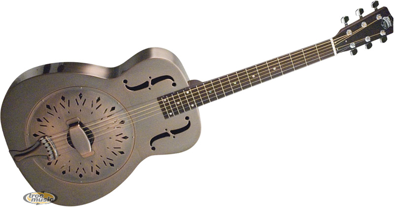 Guitare à résonateur METAL BODY finition Métal Antique. Mécaniques : Gotoh chromées à bain d'huile. Manche : Acajou du Honduras, jonction à la 14ème frette. Touche : Palissandre. Corps : Bell brass chromé, cône Aluminium 9,5'', ouïes en ''f''. Chevalet : Erable. Finition : Antique brossé.
