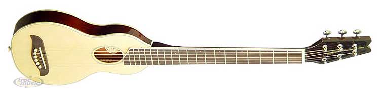 Guitare de voyage cordes acier. Diapason 24'' standard. Table en épicéa massif. Caisse et manche en acajou. Livré avec étui, 3 médiators, sangle, CD Rom.