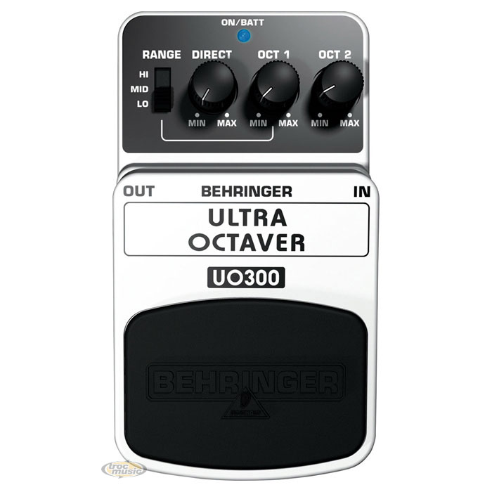 Pédale d'octaveur. Ajoute 2 sons à celui de la guitare, 1 et 2 octaves sous le son original. Réglages de volume aux trois sons. Sélecteur Range 3 modes.