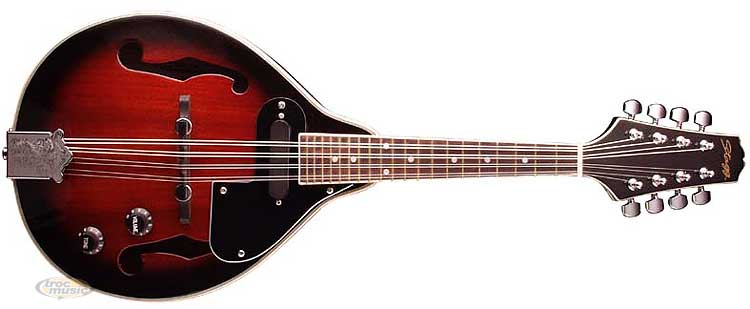 Mandoline Bluegrass électro-acoustique avec table en nato. Dos et éclisses tilleul. Manche nato. Touche palissandre. Ouïes: 2 clés en F. Préampli passif.