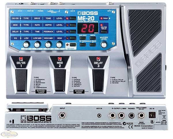 Pédalier multi-effets guitare électrique: overdrive, disto, delay, chorus, phaser, flanger, tremolo, rotary et egaliseur.