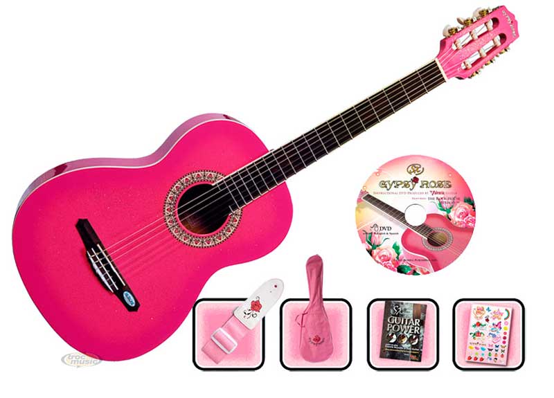 Pack guitare classique pour les filles: guitare rose de taille 7/8 et manche plus fin. Livré avec accessoires: housse, autocollants, DVD.