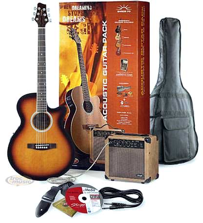 Set guitare folk électro-acoustique cutaway SW206CETU + ampli acoustique d'entrainement 10 W Stagg 10 AA. Livré avec pack accessoires.