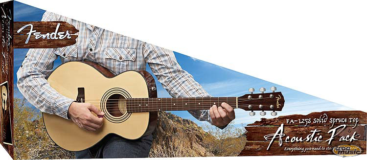 Kit guitare folk Fender FA-125S à table massive, finition naturelle livré avec accordeur électronique, housse, médiators et tourne-mécanique.