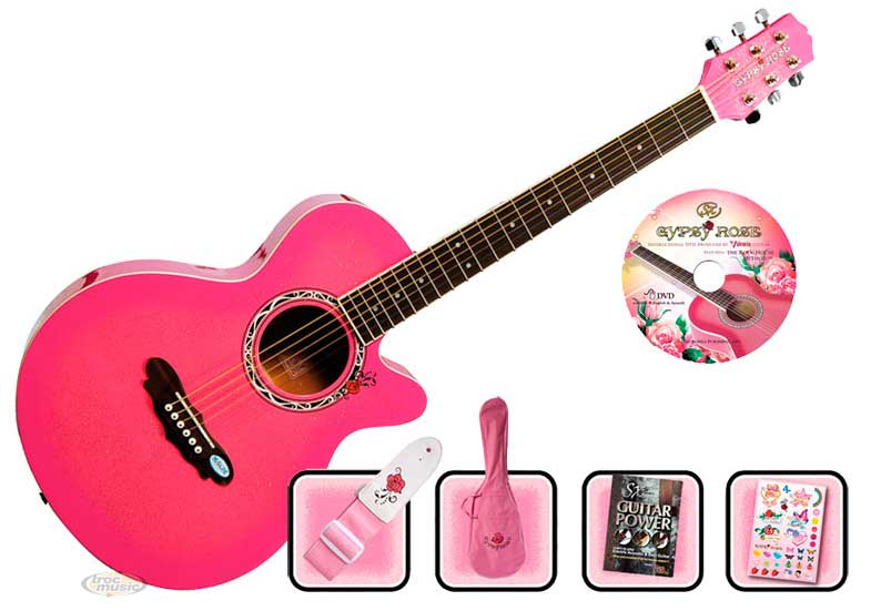 Pack folk adapté aux filles: guitare rose taille 7/8 et accessoires fantaisies: housse, autocollants, courroie, DVD.