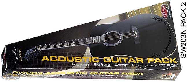 Pack guitare acoustique dreadnought Stagg SW203. Accessoires: bandoulière, diapason, housse, cordes, CD Rom, accordeur, métronome, enregistreur digital.