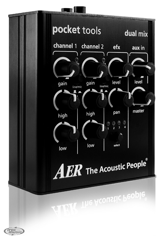 Préampli 2 canaux pour guitare acoustique AER de la série Pocket Tools. EQ 2 bandes. Gain individuel pour chaque canal. Effet numérique 4 presets avec contrôle de niveau et de panoramique. Alimentation fantôme 24V sélectionnable pour chaque canal. Entrée aux. Prise casque. Sortie DI. Sortie ligne.
