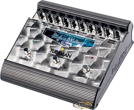 | 3 canaux indépendants à lampe (12AX7A/ECC83). Contrôles: Clean Volume, Crunch, Gain, Crunch Volume, Lead Gain, Voicing, Lead Volume, Bass, Mid, Treble, Master Volume. Switch : Canal 1, 2, 3. Connections : Input, To Mixer, To Guitar, Power Amp. 1 sortie simulation haut-parleur identique à celui de la RED BOX. Adaptateur secteur fourni. Poids et dimensions : 2,2 kg; 220x215x80mm. |