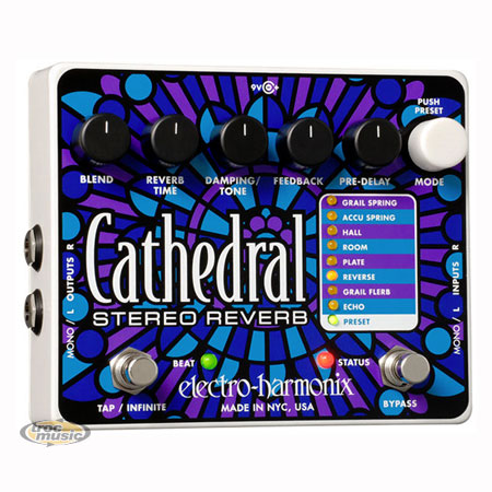 Reverb guitare stéréo programmable (8 presets) avec entrées et sorties stéréo, tap tempo. Alimentation fournie.