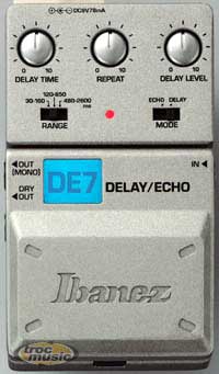 Pédale de delai et d'echo pour guitare, contrôles: Delay Time, Repeat, Delay Level. Sélecteur Delay range.