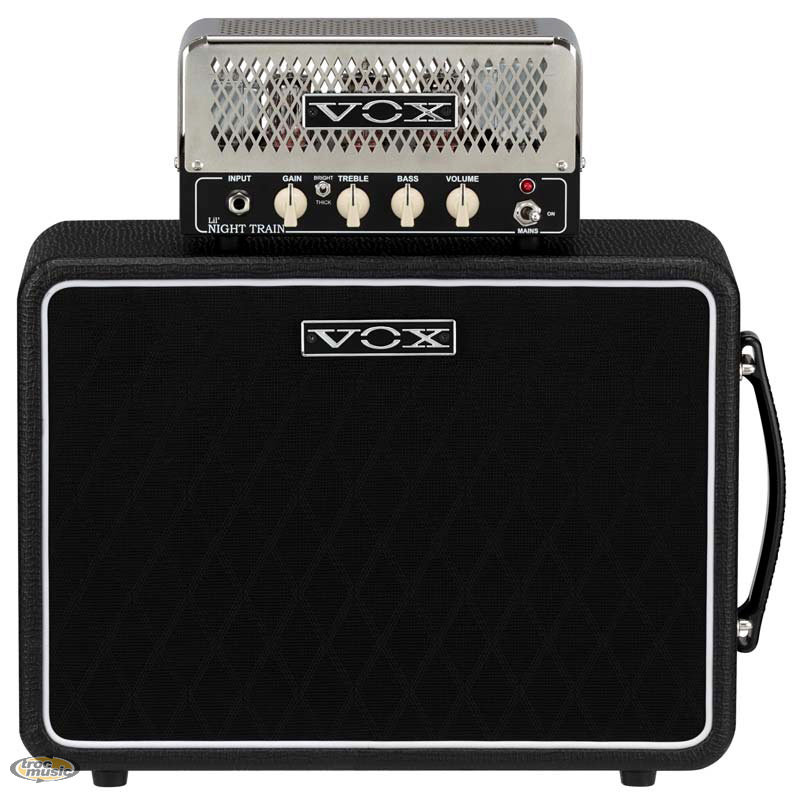 | Combinaison tête + baffle stylée et ultra-compacte d'une puissance de 2 Watts. Tête d'ampli tout lampes. Préampli : 2 lampes 12AX7. Ampli de puissance : 1 lampe 12AU7. Contrôles : gain, volume, grave et aigu. 2 Modes : Bright pour augenter la brilliance / Thick pour épaissir les mediums. Sortie hybride casque/ligne avec simulation de haut-parleur. Sortie haut-parleur 8 ou 16 Ohm. Baffle VOX V110NT avec haut-parleur Celestion VX 10 pouces (25.4 cm). |