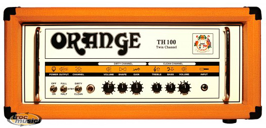 Tête d'ampli guitare électrique ORANGE de la série Thunder. Puissance. 35 ou 70 Watts Class AB-1 (Output Half). 50 ou 100 Watts Class AB-2 (Output Full). Les lampes d'amplification saturent plus vite en mode Half (Class AB-1). Lampes de préampli : 4 x ECC83/12AX7. Lampes de puissance : 4 x EL34. CLEAN CHANNEL: Volume. Bass. Treble. DIRTY CHANNEL: Volume. Shape. Gain.