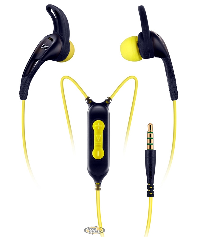 | Ecouteurs intra-auriculaires Sennheiser-Adidas avec micro, pour le sport et les appels. Transducteur dynamique. Réponse en fréquence : 18 - 20 000 Hz. Niveau maximal de pression sonore (SPL): 120 dB. Impédance nominale 16 ohms. Connecteur Jack 3,5 mm stéréo. Longueur de câble : 0,6 m + rallonge 0,6 m avec contrôle volume. Poids sans cable : 14 g. |