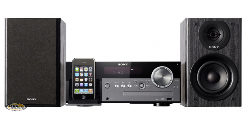 Micro-chaîne hi-fi avec station iPod. 60 W RMS, amplificateur num. S-Master, USB, iPod, CD, tuner FM, entrée audio, télécommande.