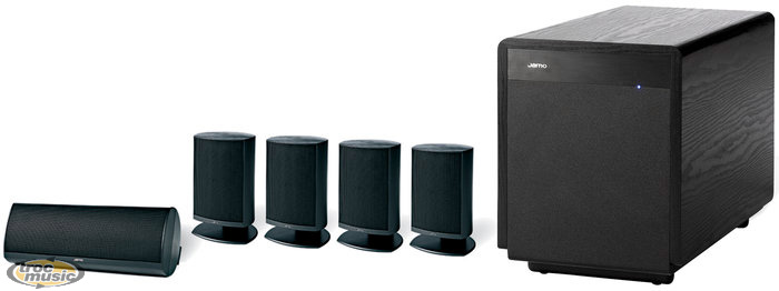 Pack d'enceintes 5.1 home-cinéma. Caisson 250 Watts (en crête), possibilités de fixation murale, satellites orientables au mur et caisson réglable.