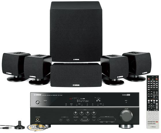 Ensemble home cinéma comprenant l'ampli Yamaha RX-V467 et le pack d'enceintes 5.1 NS-P285 (4 enceintes satellite, l'enceinte centrale et le caisson de grave). Finitions : Noir ou Titane.