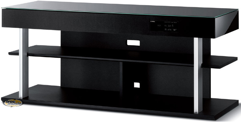 Meuble TV audio-vidéo avec son cinéma intégré pour écran jusqu'` 116 cm, puissance totale 112 Watts, 18 enceintes et 1 caisson de basses, 2 entrées / 1 sortie HDMI 1080p/24 et calibrage automatique IntelliBeam.
