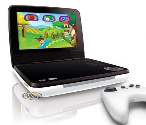 Lecteur DVD portable doté d'une fonction jeu et d'un clavier. Écran LCD de 18 cm, 3 heures d'autonomie.