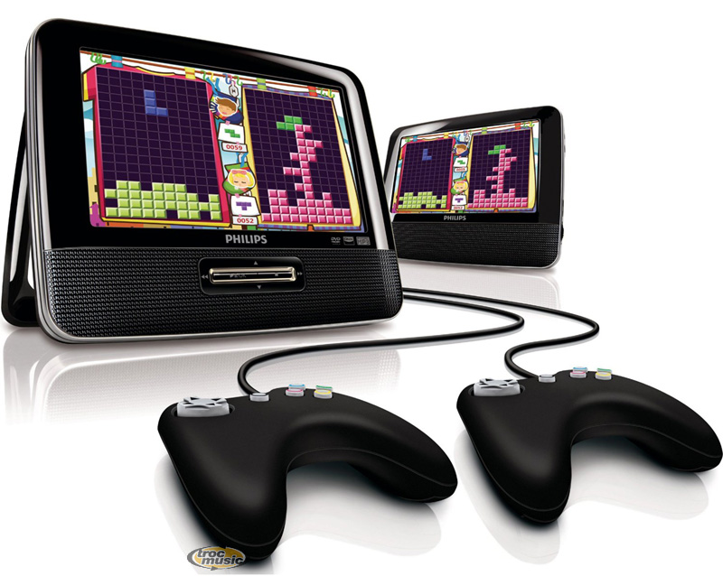 Lecteur de DVD portable avec double écran LCD de 18 cm. Certifié DivX. CD de jeux. Reprise après interruption. Lecture de CD-MP3, CD et CD-RW. Adaptateur CA/CC. Affichage de fichiers JPEG à partir d'un CD photo. Prise casque stéréo.