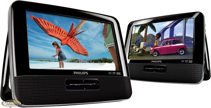 Lecteur de DVD portable avec double écran LCD de 18 cm, double lecteur, prise casque, autonomie 2 heures sur batterie rechargeable, compatible MP3, DivX et JPEG, sortie A/V, télécommande, chargeur sur allume-cigare et kit de fixation voiture.