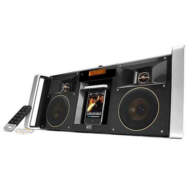 Station d'accueil pour iPod type BoomBox, 2 haut-parleurs, radio FM RDS, écran LCD avec affichage des informations musicales, alimention piles ou secteur, télécommandes.