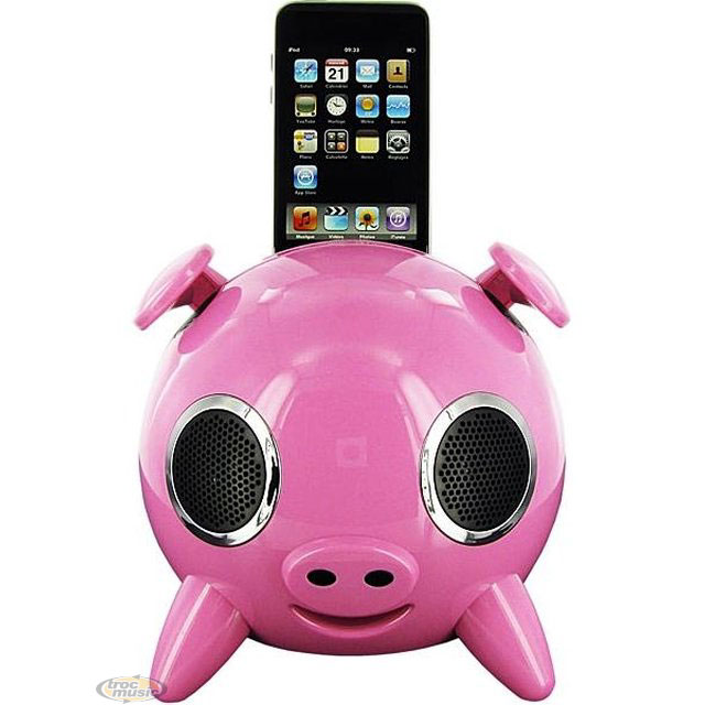 Station d'accueil iPod, 25 Watts RMS, design cochon. Existe en plusieurs couleurs : rose, rouge, noir, blanc, jaune.