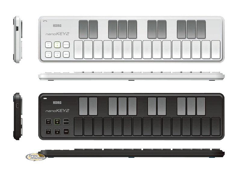 Clavier très compact de 25 touches sensibles à la vélocité (4 courbes de réponse) avec 6 boutons : octave +/- (4 octaves), pitch +/-, mudulation et sustain. Connecteur mini USB. Alimenté par USB. Disponible en Noir : NANOKEY2-BK ou Blanc : NANOKEY2-WH.