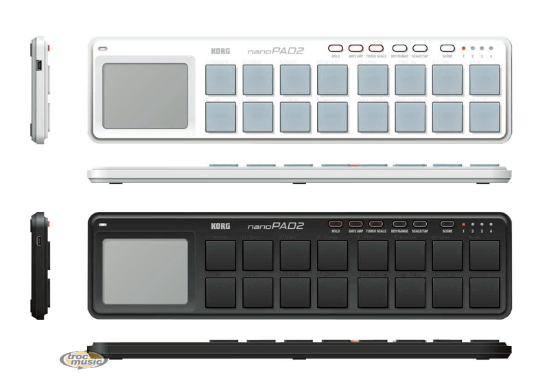 Surface de contrôle 16 pads sensibles à la vélacité et 4 courbes de réponse, un pad X-Y, boutons HOLD, GATE ARP, TOUCH SCALE, KEY/RANGE, SCALE/ARP, SCENE (4 mémoires). Prise au format mini USB. Disponible en noir : NANOPAD2-BK, ou blanc : NANOPAD2-WH.