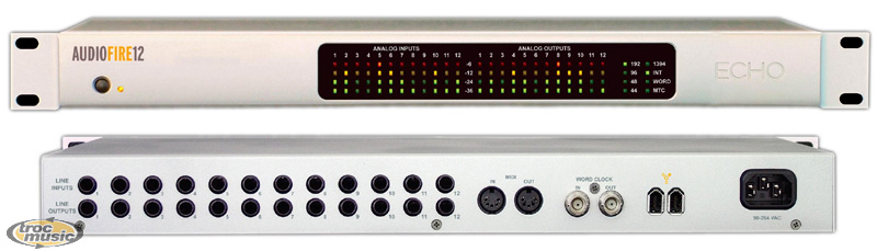 12 entrées analogiques symétriques +4dBu sur Jack â¼'. 12 entrées analogiques symétriques +4dBu sur Jack â¼'. 1 entrée / sortie MIDI. 1 entrée / sortie Word Clock. Possibilité de monter l'unité en rack 1U grâce aux oreilles de rack fournies. 2 ports FireWire pour permettre de cascader les interfaces. Pilote faible latence pour hôte Macintosh OSX et PC Windows. Logiciel TRACKTION inclus.