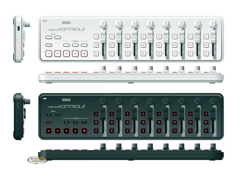 | Mini surface de contrôle dotée de 8 potentiomètres linéaires, 8 potntiomètres rotatifs, 24 boutons, une section de transport (REW/FF/STOP/PLAY/REC), un bouton CYCLE, un bouton MARKER (avec boutons Précédent/Suivant associés) et un bouton TRACK. Prise mini USB. Disponible en Noir : NANOKONTROL2-BK, ou Blanc : NANOKONTROL2-WH. |