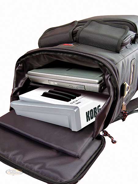 Housse semi rigide à roulettes pour clavier de commande de 25 à 37 touches, ordinateur portable, interface et connectique. Dimensions externes : 60,96 x 40,64 x 30,48 cm.