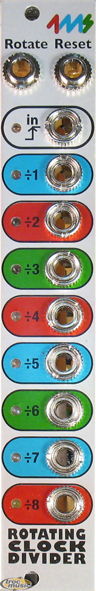 | Un utilitaire quasi indispensable dans un modulaire. Comme son nom l'indique il permet de diviser une horloges pour la redistribuer sur des séquenceurs, des enveloppes, des sample & hold et tout module muni d'une entrée trig ou gate, votre imagination fera le reste. Interfacé avec son extension, le RCD BREAKOUT, ses possibilités sont décuplés. L'horloge connectée est divisée de 1 à 64. CV Rotate jack permet de décaler les sorties. CV Reset permet de faire un reset/re-sync de tous les jacks.. |