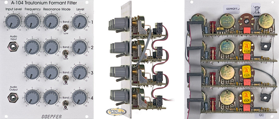 | A-104 is a fourfold formant filter as used in the Mixtur Trautonium by Oskar Sala. It is made of four parallel resonance filters, each filter can be switched to low pass or band pass or off. Frequency, resonance and level are controlled for each filter separately (no voltage control). The frequency range for the filters is about 50Hz...5kHz.. |