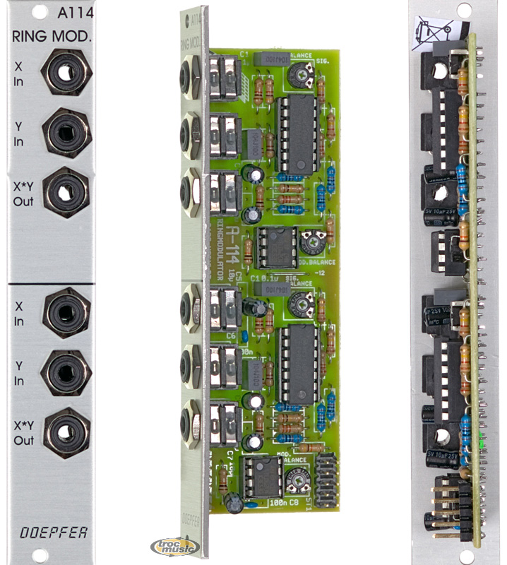 Module A-114 contains two separate ring modulators. A ring modulator outputs the product (Multiplication X â• Y) of the signals at inputs X and Y. It's similar to a VCA, but whereas a VCA only responds to positive voltages at the inputs (2-quadrant multiplication), the ring modulator responds to both positive and negative voltages (4-quadrant multiplication)..