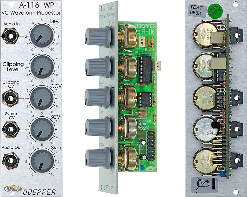 Module A-116 provides voltage-controlled dynamic waveform modification of audio signals. It can produce new waveforms from the standard VCO shapes, and modulate these changes in real time. The signal first of all goes through an input amplifier, which can attenuate the signal as well as amplify it by up to a factor of 2..