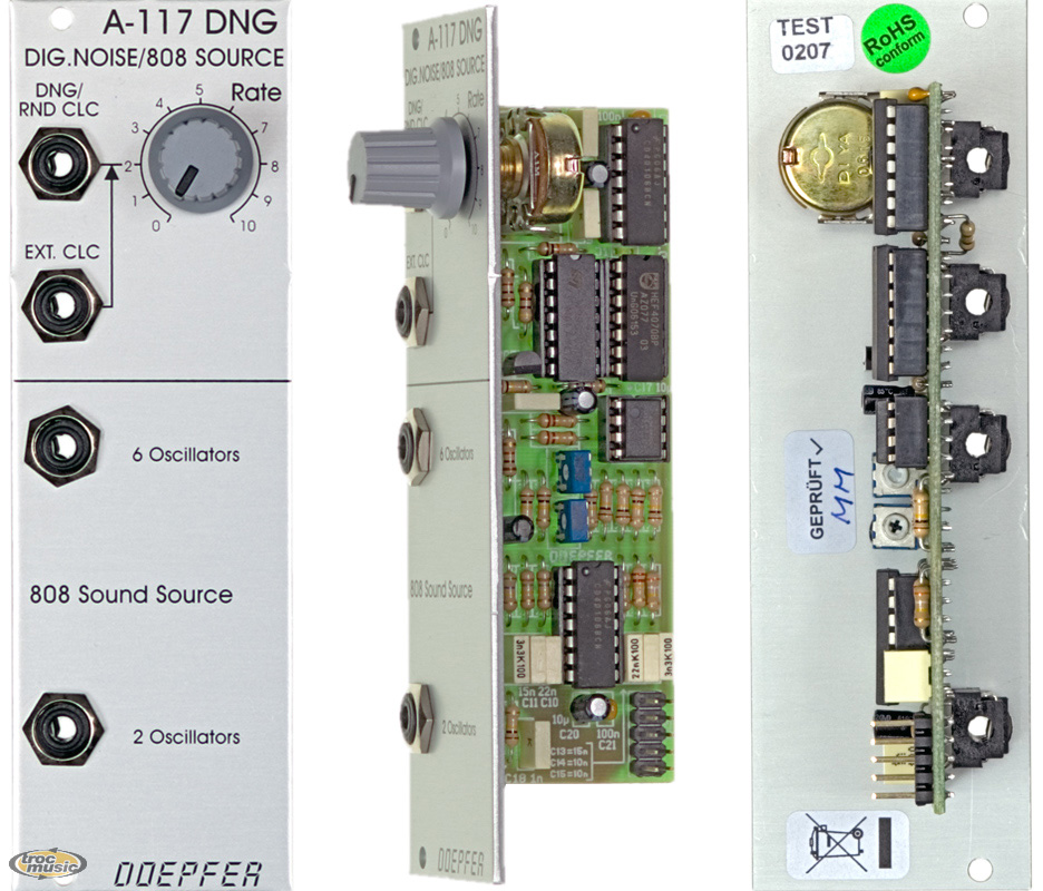| Module A-117 (DNG) is a combination module, including a digital noise generator and an 808 source. The digital noise generator uses random sequences of square waves (18 step shift register with multiple feedback), whose rate can go from random clicks to pure noise. The colour of the noise is very different from the analog noise produced by the A-118.In addition to a manual setting, the rate can be controlled by an external clock - eg. VCO, LFO or MIDI clock.. |