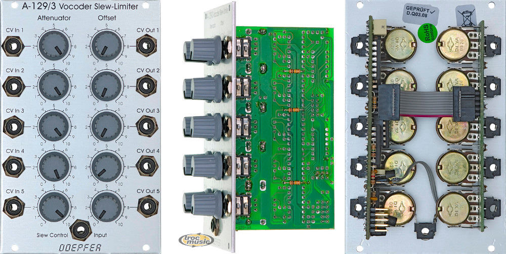| The Five-way VC slew Limiter / offset generator / attenuators (A-129 /3) and Slew controllers (A-129/4) are particularly designed for this purpose. Module A-129 /3 includes 5-way Attenuators, 5-way Offset Generators, and a Slew Limiter (which works on all the voltages at the five CV inputs simultaneously). Using the A-129 /3 just on its own, two functions are available:. |
