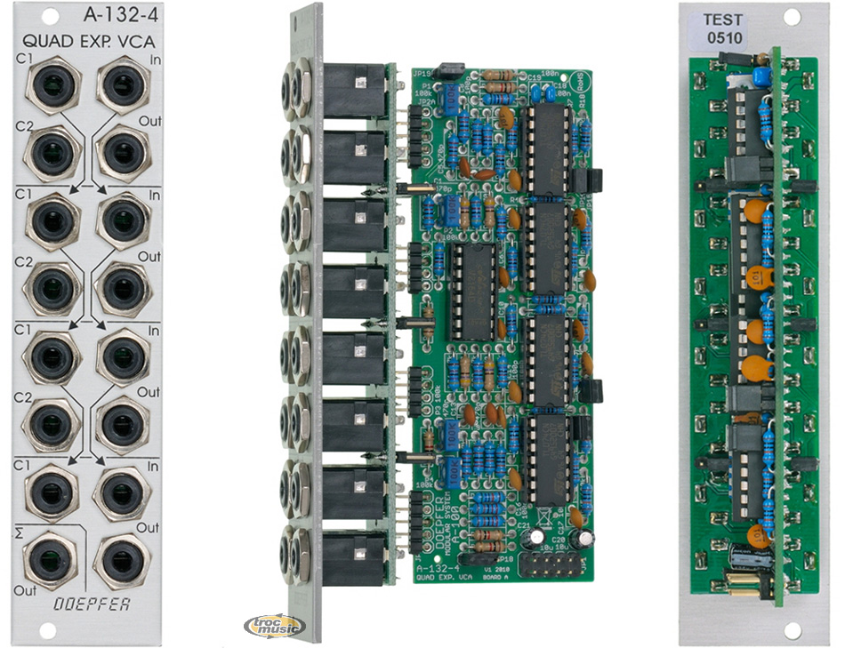The control Scale for each VCA is about 12dB/V (i.e. 1 V CV decrease corresponds to 12dB level decrease and 1 V CV inrease corresponds to 12dB level increase). 0V CV corresponds to about -60dB (i.e. about attenuation by 1000). +5V CV corresponds to about 0dB (i.e. no attenuation or amplification = 1). .