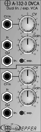 Le Module A-132-3 est composé de 2 VCA (Ampli Contrôlé en Tension)strictement identiques. Chaque VCA est équipé d'un bouton pour le gain, d'une entrée CV avec son bouton d'atténuation. La réaction du contrôle peut être choisi entre linaire et exponentiel. Les entrée VCA peuvent être utilisés pour un signal audio ou une tension de contrôle. All inputs and outputs are DC coupled. Les entrée n'ont pas d'atténuateurs mais acceptent des tensions de 16Vss (de -8V à +8V) sans distorsion. 2 in audio et cv. 2 out audio et cv. 2 cv in.